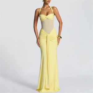 Жёлтое длинное платье на шнуровке через шею с сетчатыми вставками
