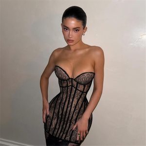 Обтягивающее платье нюдового цвета с чёрным кружевом, сексуального фасона